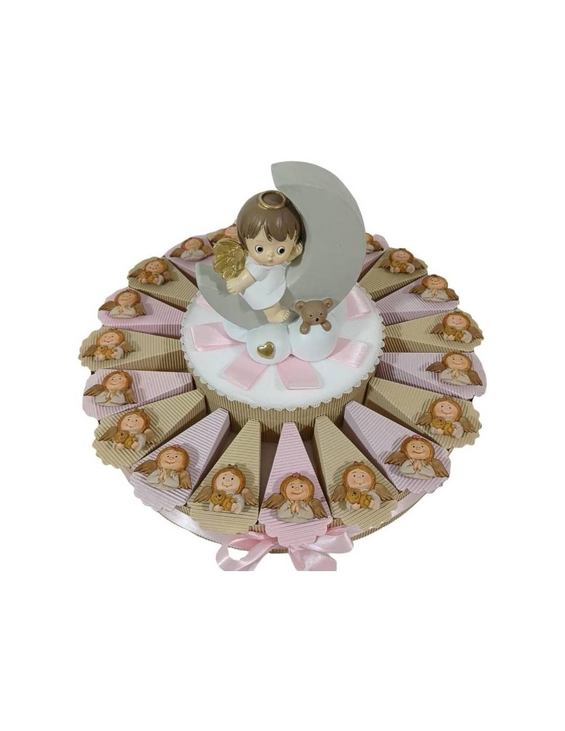 Torta per confetti dove attaccare questi angioletti bambina per avere le bomboniere Comunione a vista con la più grande al centro.