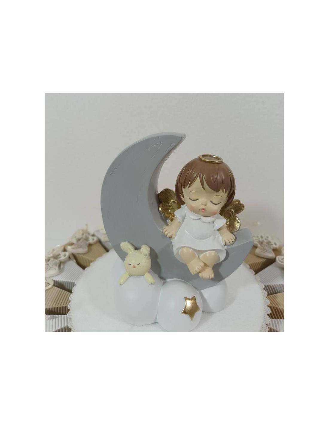 Torta porta bomboniere angioletti con tunica color beige con dettagli oro e tra le mani la stella o la luna appoggiati sulla luna, la stella o la nuvola