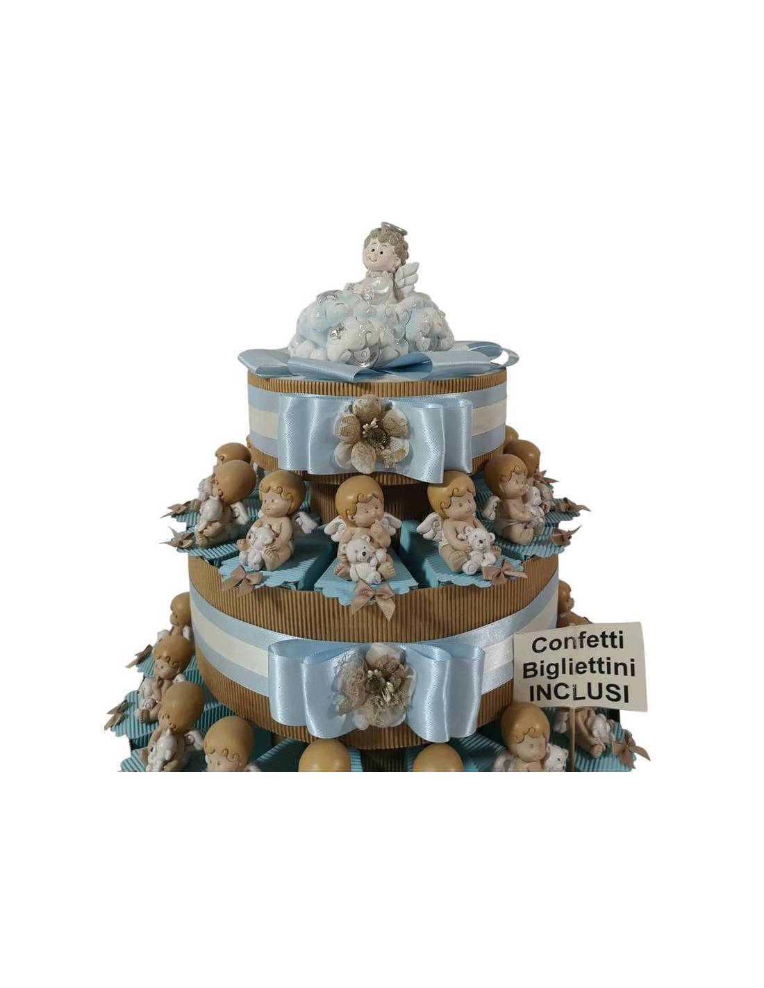 Torta per battesimo nascita a tema angioletti con in mano tenero peluche orsetto. La struttura della torta è di colore beige e le fette sono di colore celeste. Con ogni fetta, oltre a confetti e bigliettino, sono presenti una bomboniera da appoggio (dimensione 4x5cm circa) a forma di angioletto con orsetto tra le mani. In cima alla struttura è presente un centrale angioletto salvadanaio (6x11x8.5cm ciurca).