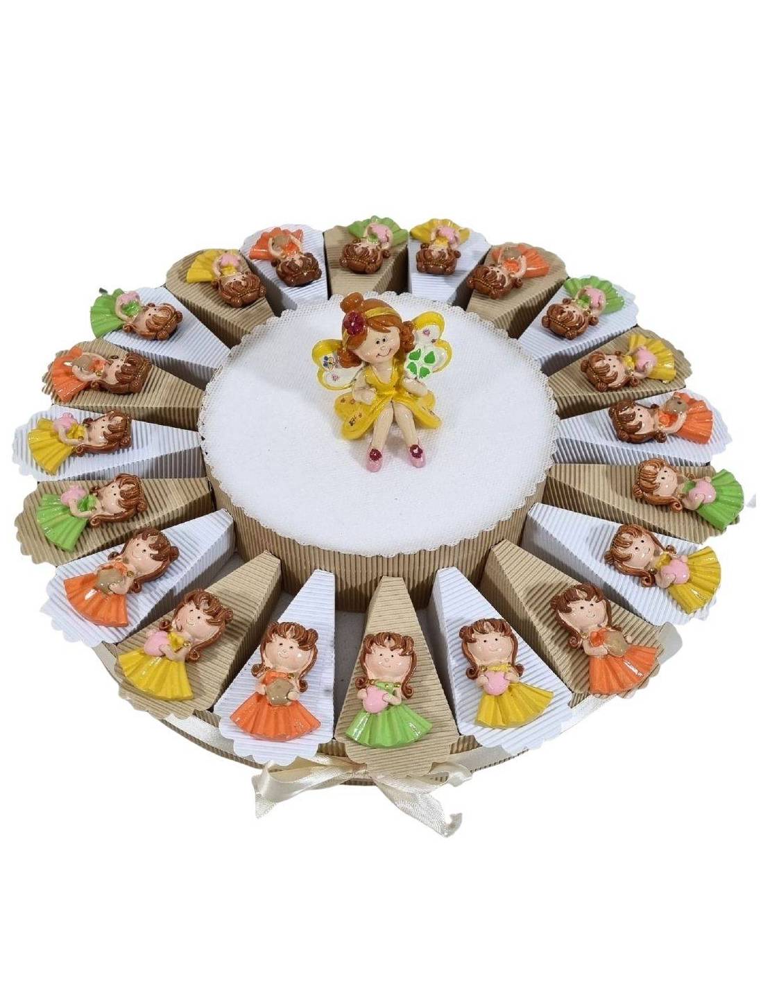 Torta per bomboniere composta da portachiavi con folletto fatina assortito in due varianti: su una lumaca gialla e su una macchinina con cuoricini rossi in mano (Dimensione: 7 cm circa) + CENTRALE fata