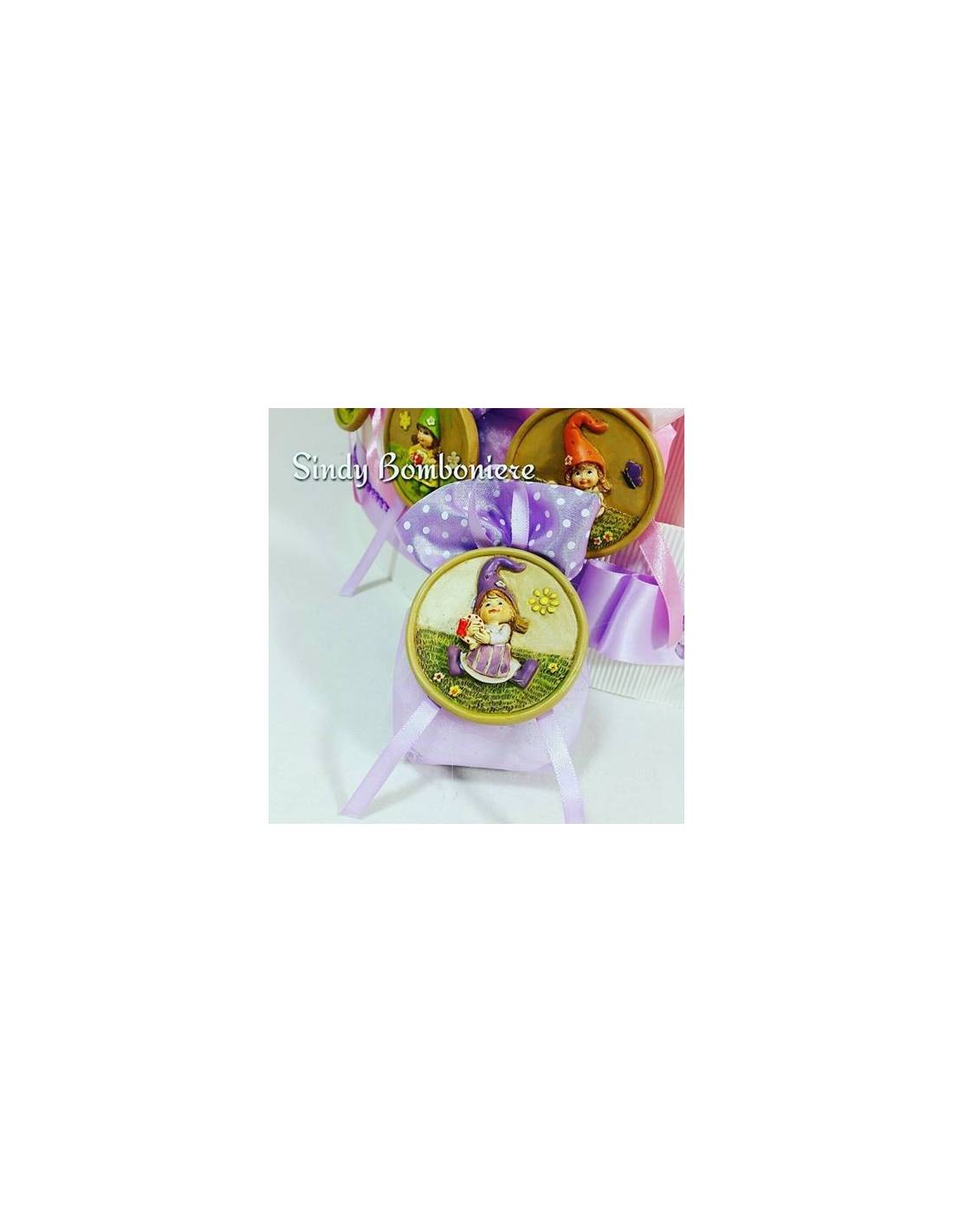 Sacchetti bomboniera con magnete fata folletto Memole prezzi online confezione inclusa. Le Calamite fatine con sacchettino portaconfetti on line prezzo outlet ma belli e di ottima qualità sono un' originale idea per bomboniere e ricordini comunione,nascita,battesimo,cresima e compleanno. I sacchetti sono di tessuto in organza rosa e lilla e nella parte superiore di stoffa in raso lucido rosa o lilla con palline pois bianchi, riempiti di ovatto con 5 confetti crispo e bigliettino chiuso con nastri di raso in tinta dimensione 10 cm. Ad Ogni sacchetto c'è abbinato una calamita magnetica materiale in resina con fata bimba in rilievo dipinte a mano (diametro 6,5 cm circa). Le fate sono assortite e alternate nei colori :verde, arancione,lilla con in mano o la staffa di cavallo, o il cuore, o il quadrifoglio sedute su un ptao verde con fiorellini e intorno delle farfalline utili da attaccare al frigorifero o alla cappa fermando così foto o messaggi. I sacchetti prezzo ingrosso possono essere acquistati anche senza torta al prezzo di 2,99 euro o confezionati su torta struttura per sacchetti arricchita e decorata con nastri, strass lilla e fucsia e con fiori per bomboniere in più nel prezzo basso costo è compreso il salvadanaio centrale (dimensioni 10*12 cm circa) che raffigura la fata seduta in auto panna con iserti argento e 2 cuori rossi in mano.Personalizzazione del prodotto