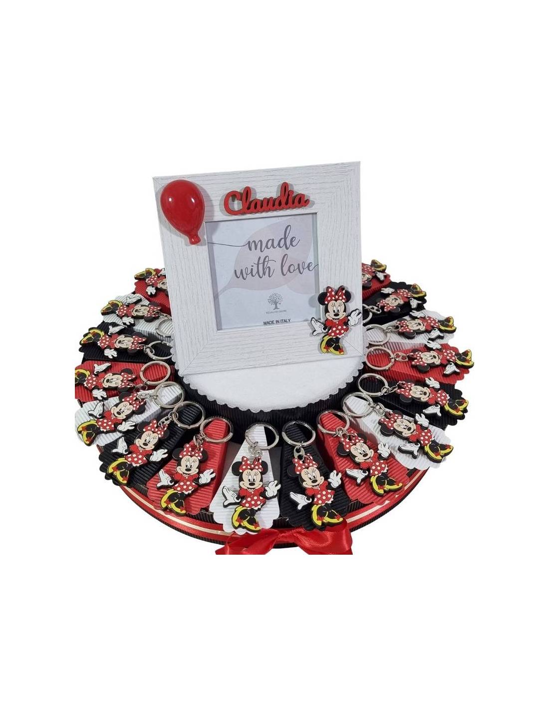 Puoi confezionare con le tue mani la torta bomboniere Topolino baby a porachiavi in quanto la struttura è montata e decorata con nastri, basterà chiudere le fette e attaccare gli oggetti.