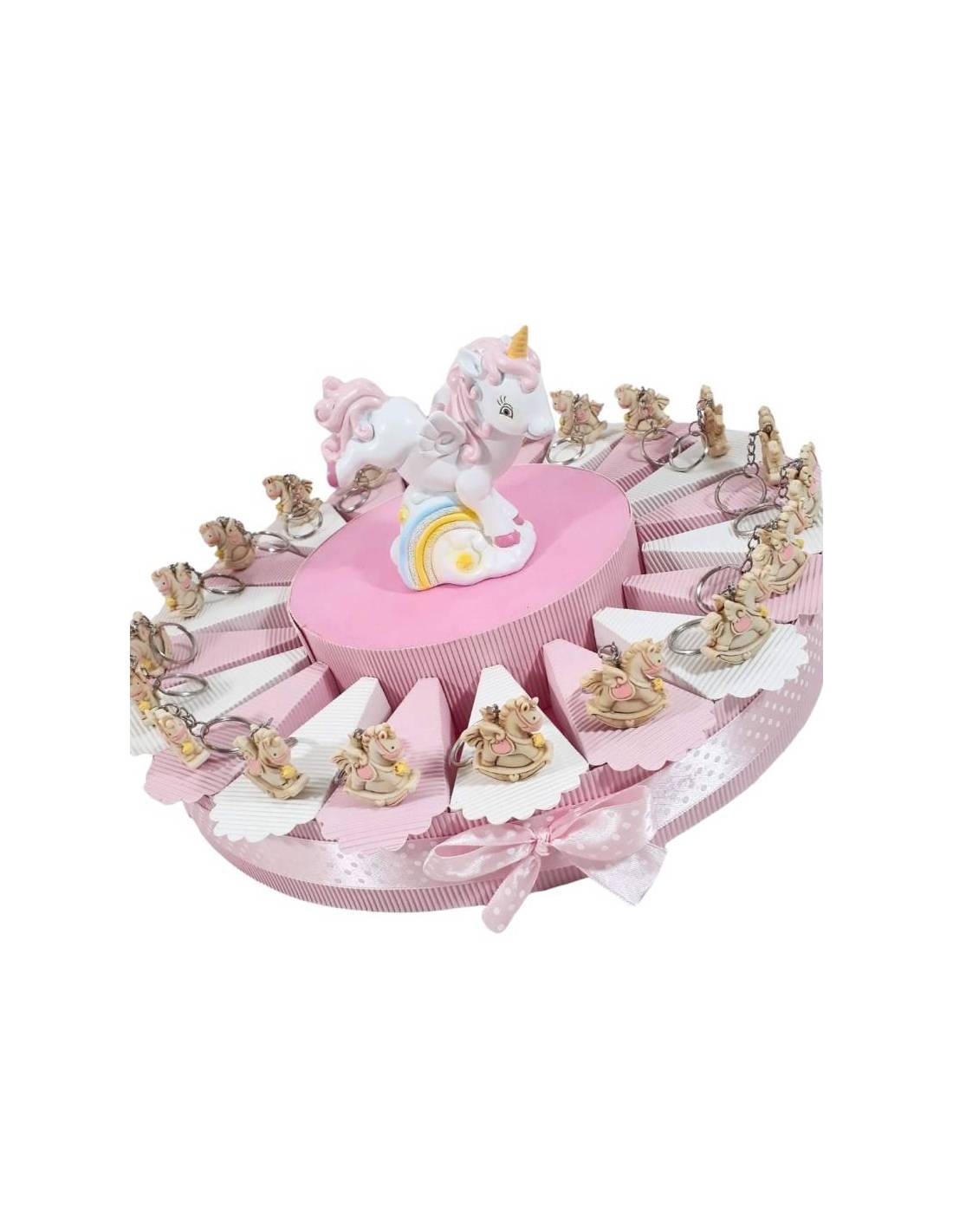 Torta portaconfetti con portachiavi unicorno in resina per bomboniere bambina Nascita o Battesimo.