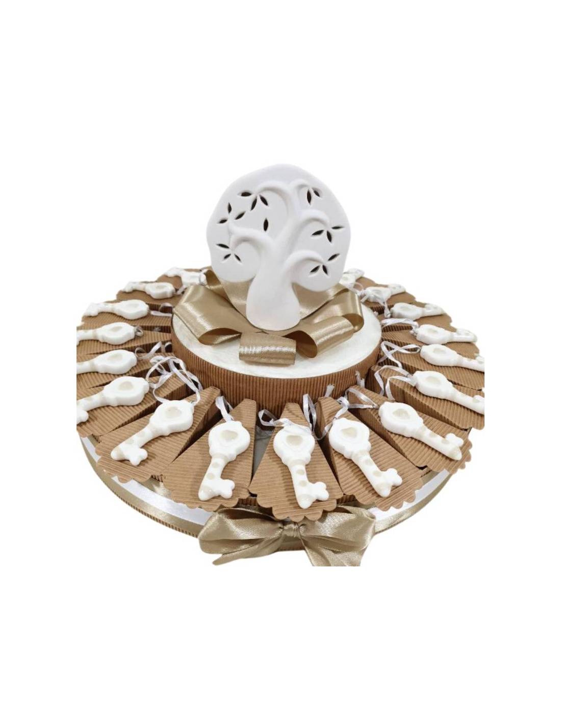 Chiavi in ceramica porcellanata lucida bianca con cuore color crema proposte sulla torta di bomboniera.