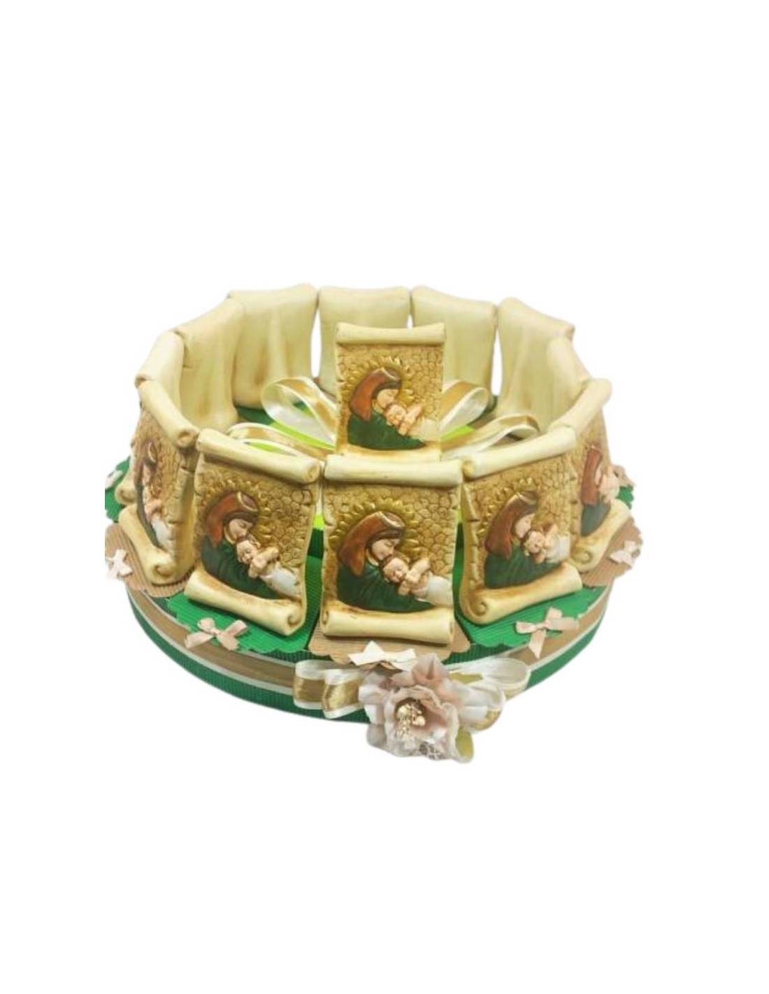 Al di sopra di ognuna delle fette possiamo trovare una bellissima e significativa icona, che propone l’immagine della Natività, elemento religioso simbolo per eccellenza, che viene riproposto anche come elemento centrale di questa composizione. I colori di questa Torta rispecchiano perfettamente quelli della Prima Comunione, mentre le fette sono di colore verde; il nastro, che decora e chiude la torta, è beige e bianco, con un fiore centrale.